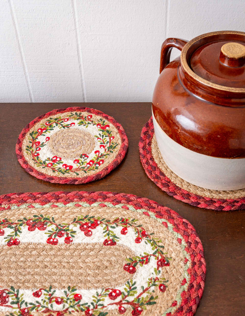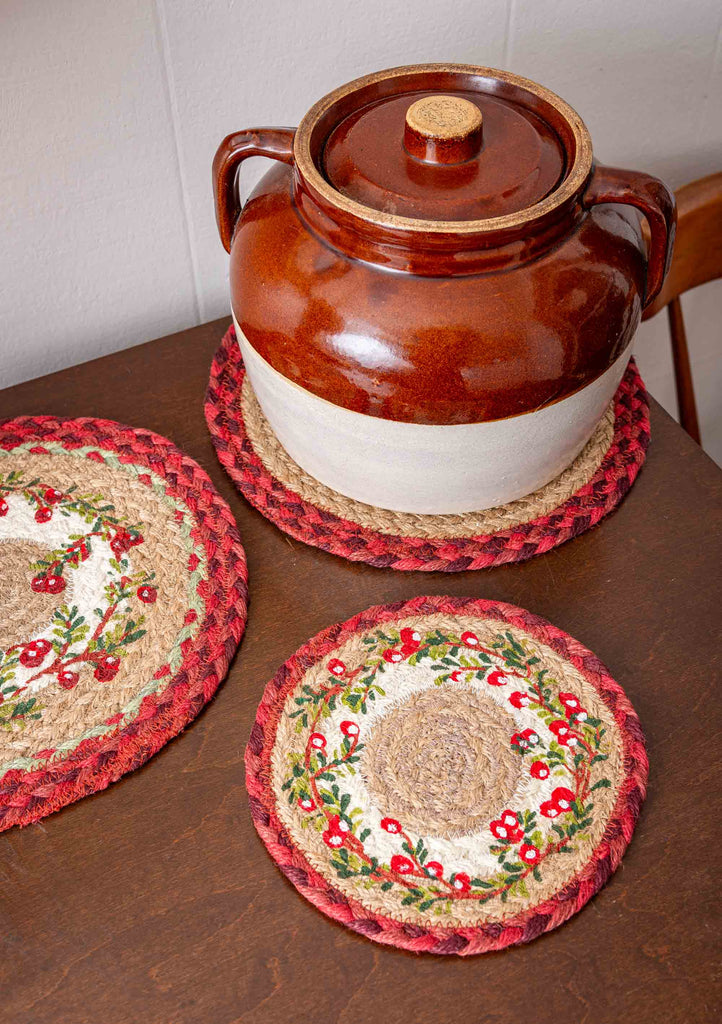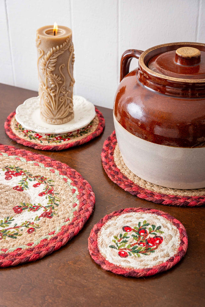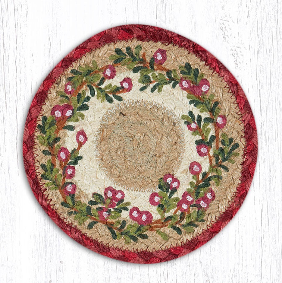 Round Hand Stenciled Coaster with Cranberries Design