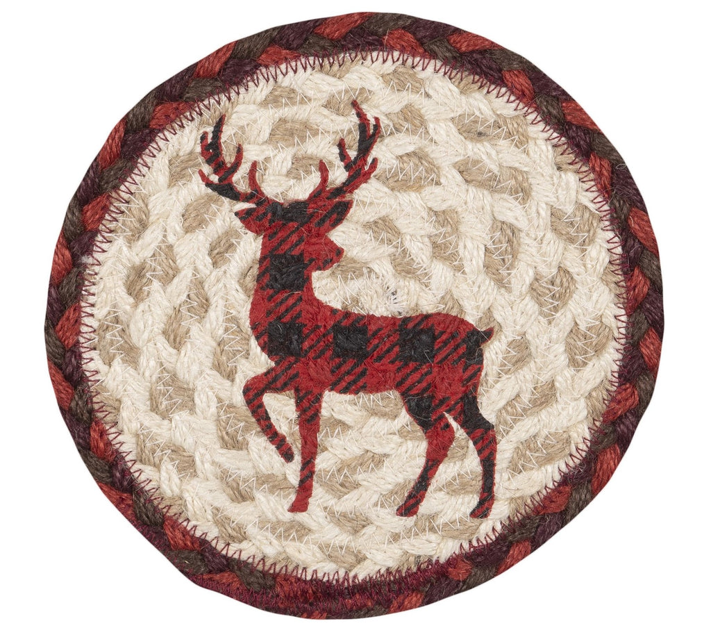 Round Hand Stenciled Coaster with Red Plaid Deer Design