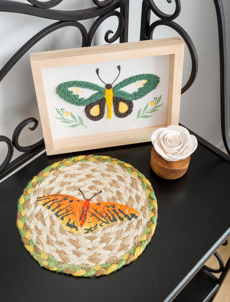7" Round Hand Stenciled Coaster with Butterfly Design
