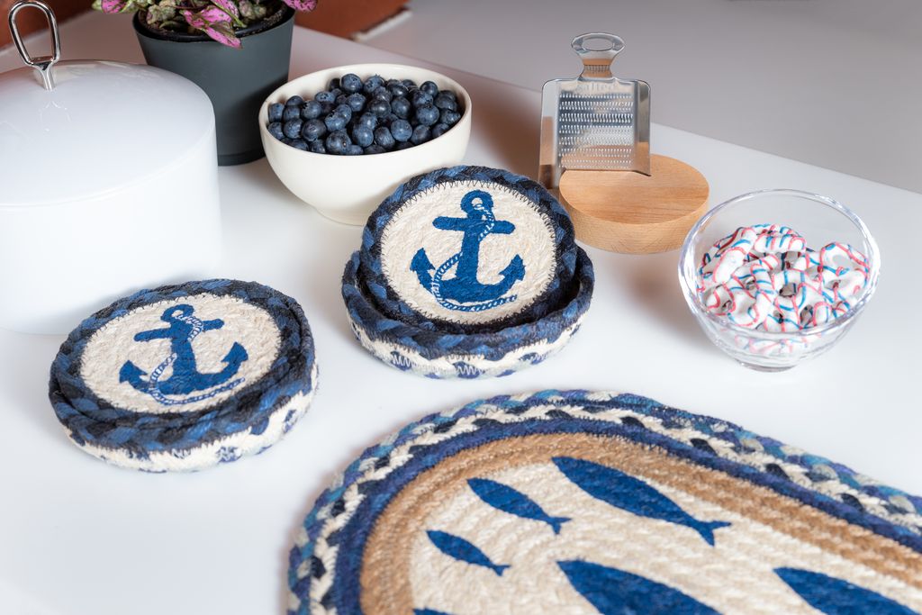 5" Round Hand Stenciled Coasters with Navy Anchor Design